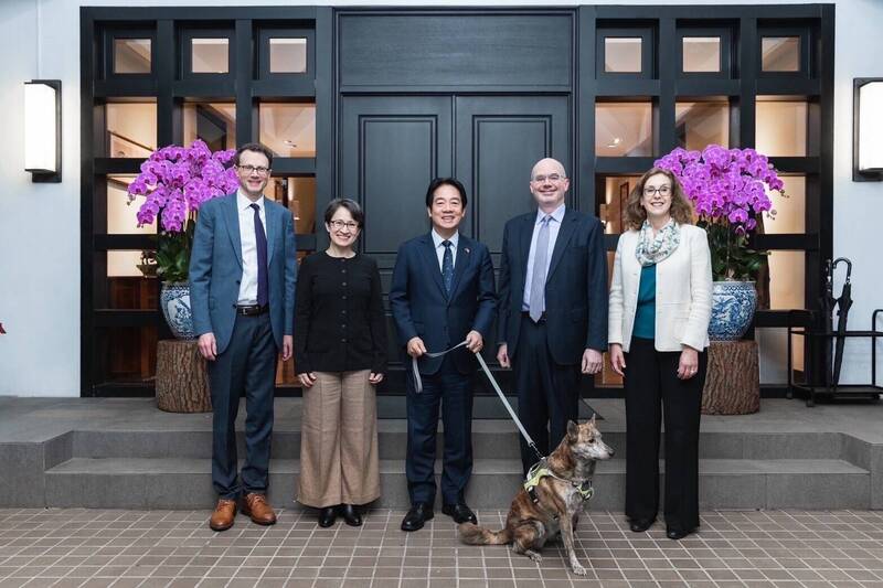 總統賴清德、副總統蕭美琴、AIT處長谷立言、AIT副處長梁凱雯(右1)、AIT政治組組長羅峻平(左1),與賴清德的愛犬於總統官邸前合影。(圖擷取自美國在台協會AIT臉書)