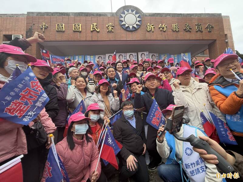 立委徐欣瑩在徐姓宗親會、議員、代表、村里長以及人民團體代表等支持者的簇擁下,步入國民黨新竹縣黨部。(記者廖雪茹攝)