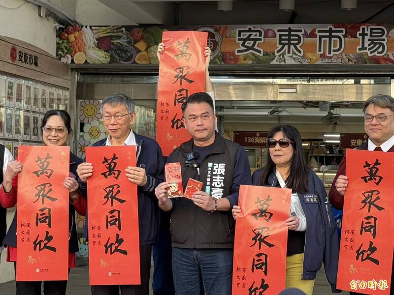 柯文哲(左二)陪同張志豪(左三)至安東市場發春聯。(記者甘孟霖攝)