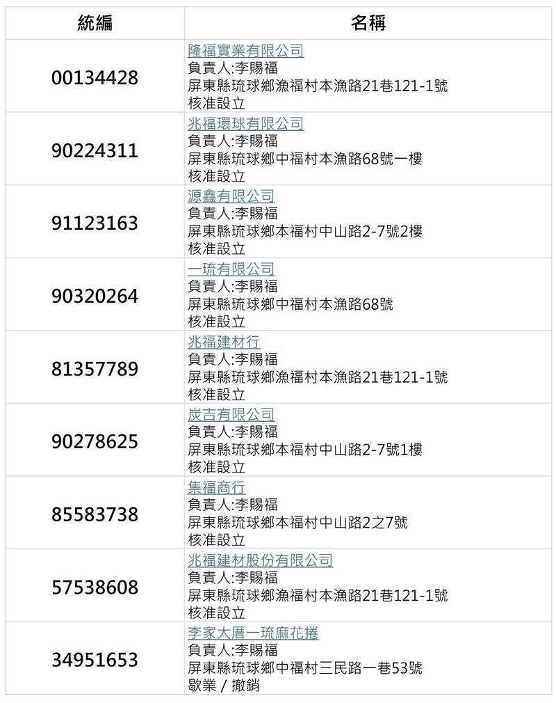 四叉貓在臉書PO文表示,李四川的惡霸親弟「李賜福」在屏東琉球鄉開了很多間公司(圖擷取自 臉書)