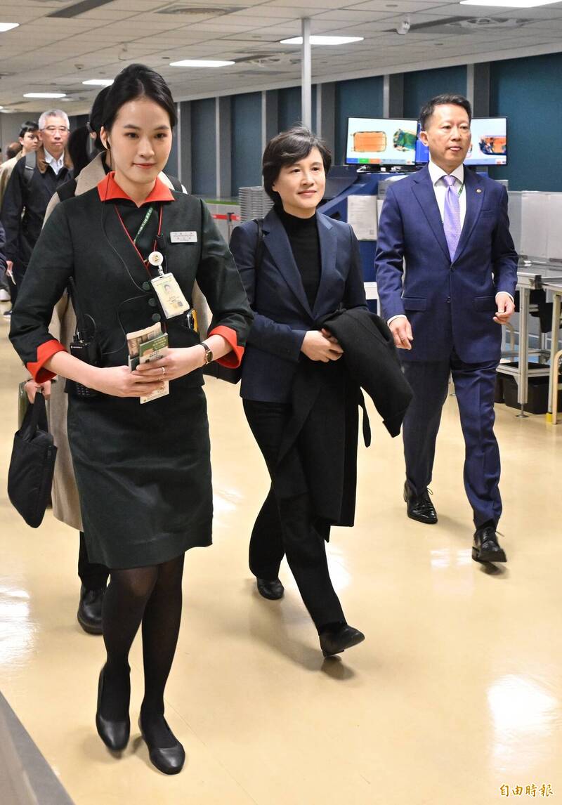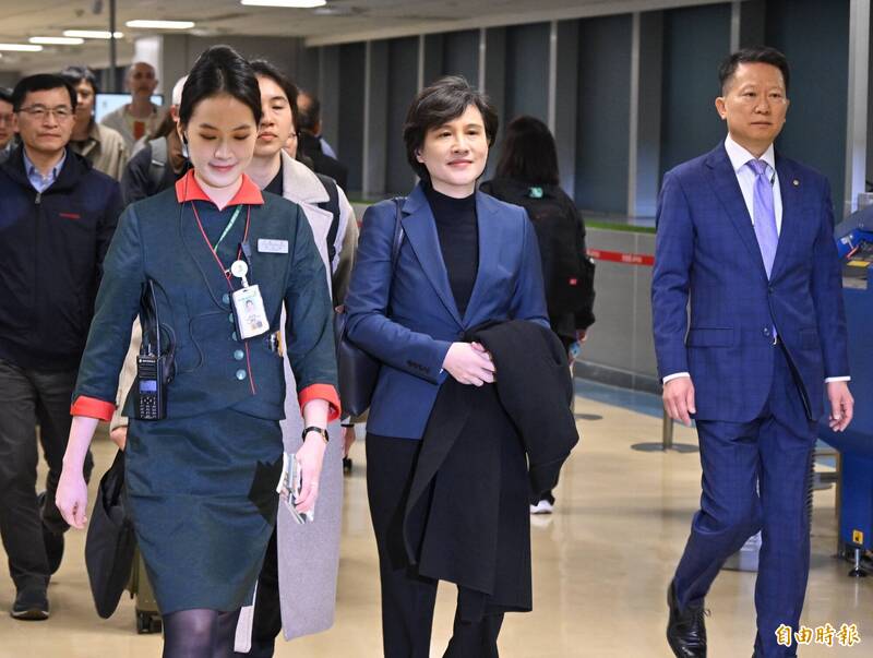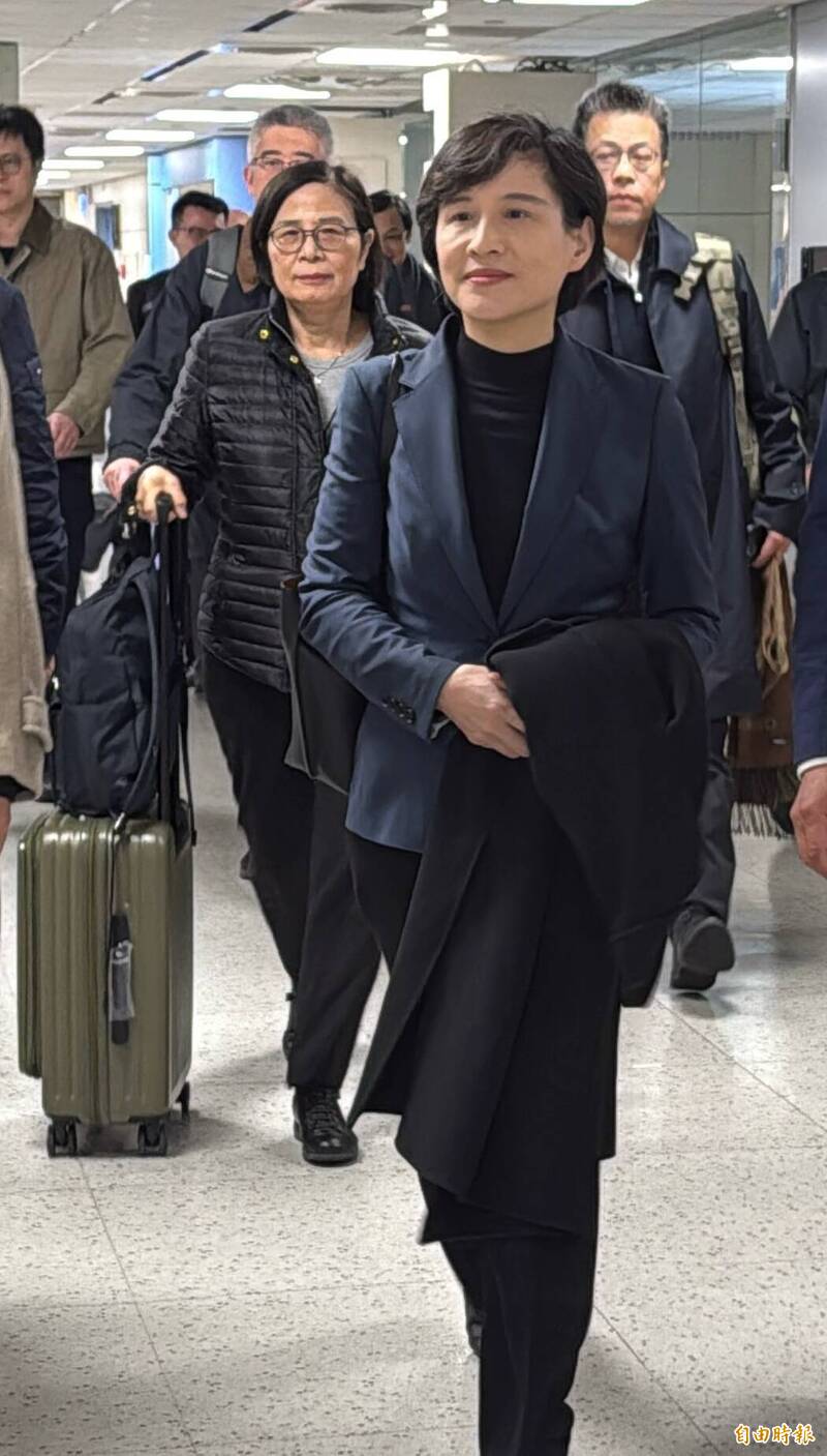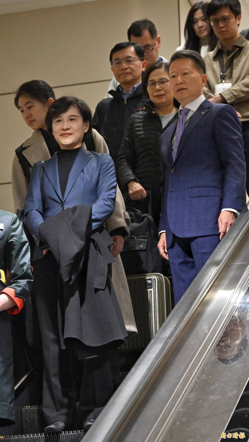 鄭麗君今晨與行政院政務委員楊珍妮、國安會諮詢委員黃重諺等人搭乘長榮航空BR31班機返台。(記者劉信德攝)
