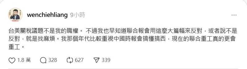 梁文傑昨晚10時許於Threads平台發布首則串文,內容提及「台美關稅議題不是我的職權。不過我也早知道聯合報會用這麼大篇幅來反對,或者說不是反對,就是找麻煩。我那個年代比較重視中國時報會『搞懂搞西』,現在的聯合重工真的更會重工。」