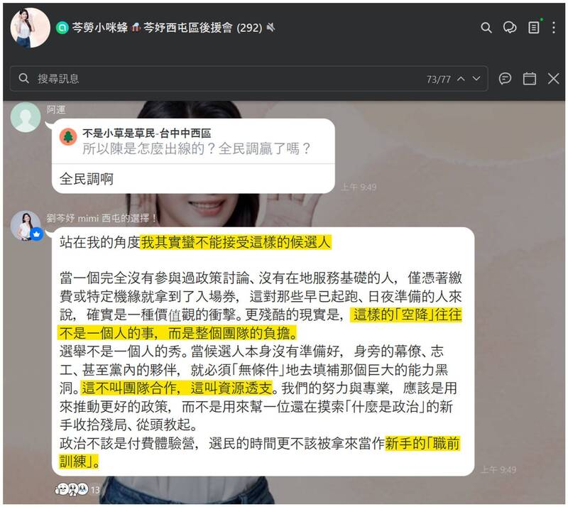 四叉貓指出,日前民眾黨三蘆選區參選人由家樂福陳彥廷勝出,陳報名黨內初選一切符合規定,不過民眾黨的台中議員候選人「淘寶女」劉芩妤馬上在LINE群發表意見,稱家樂福陳先生是「空降」才成為候選人。(圖擷自臉書)