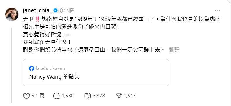 台北101董事長賈永婕昨(15日)在社群平台Threads發文,坦言自己過去因時代背景對民主前輩鄭南榕產生嚴重誤解,並為此深感自責與慚愧。該貼文引發廣大網友共鳴,除了大讚賈董「妳讓我們看見真相」、勇氣可嘉,也紛紛留言感謝民主前輩的犧牲,並強調「自由民主從來不是免費的」。