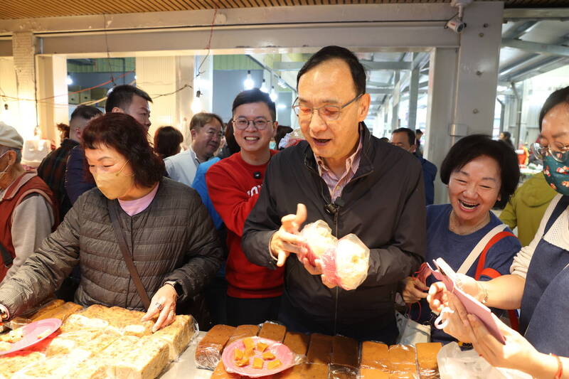 大年初二,前國民黨主席朱立倫也回到桃園與「二寶爸」桃園市議員凌濤,前往新永和市場、南門市場採買年貨,準備化身「朱大廚」親自下廚。(朱立倫辦公室提供)
