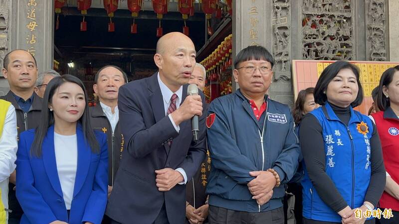 立法院長韓國瑜在雲林縣長張麗善、立委張嘉郡、許宇甄等人陪同下,到斗南順安宮發福袋。(記者黃淑莉攝)