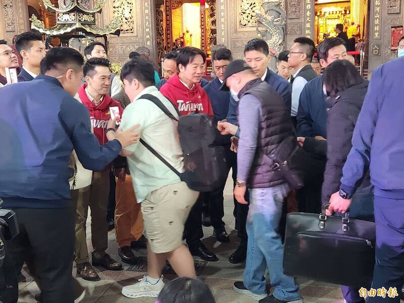 賴清德總統(中)前往桃園大廟景福宮參香,並發送福袋給民眾。(記者周敏鴻攝)