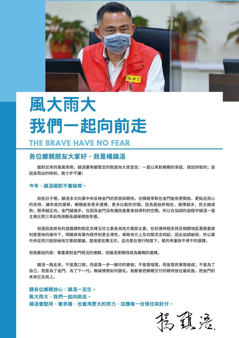 國民黨籍前金門縣長楊鎮浯今天透過服務處表示,針對國民黨中央可能通過提名陳玉珍代表國民黨參選金門縣長的決定予以尊重,楊強調,承擔金門、守護鄉親的心意不變,他向支持者喊話「風大雨大,我們一起向前走。」