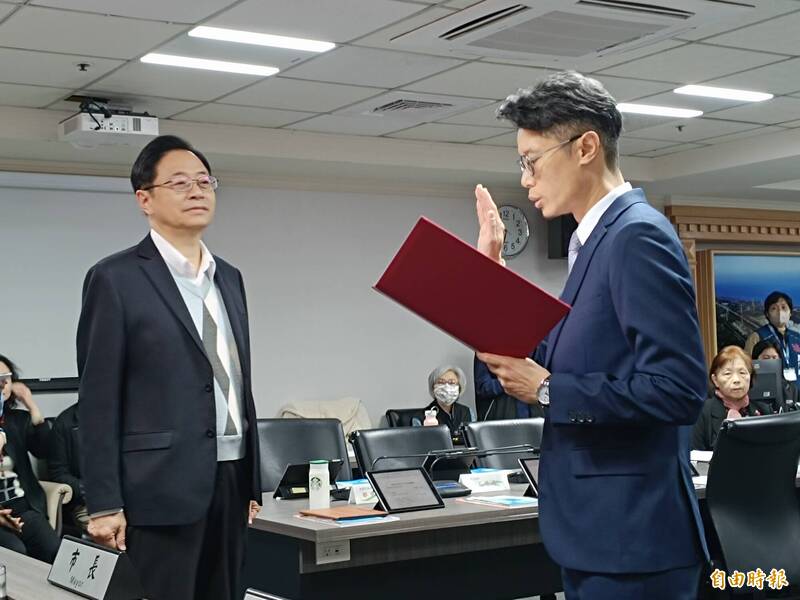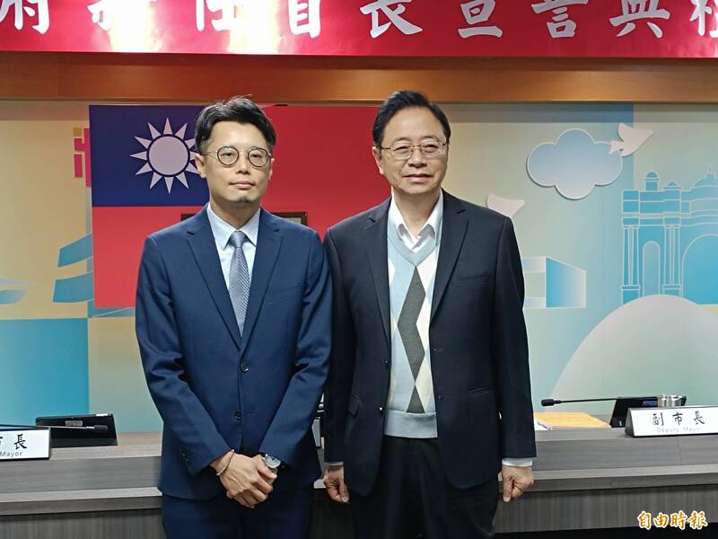 桃市府秘書處長曾俊豪(左)4日宣誓就職,市長張善政(右)擔任監誓人。(記者鄭淑婷攝)