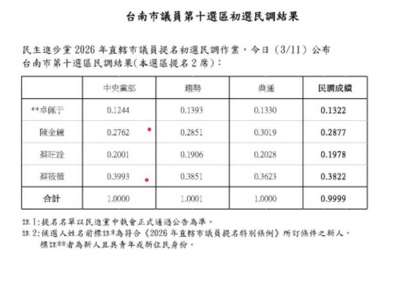 民進黨台南南市東區市議員初選民調結果揭曉。(民進黨南市黨部提供)