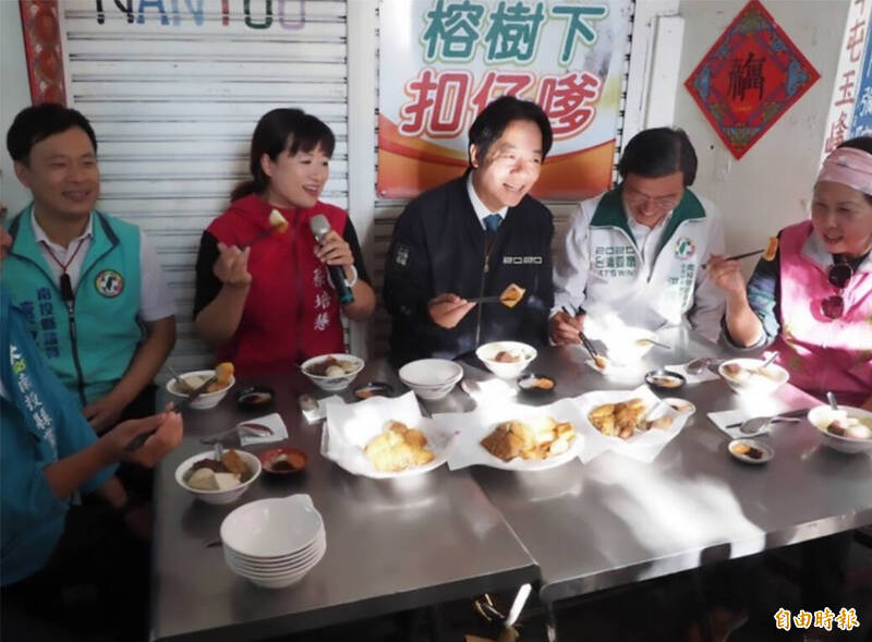 賴清德(左3)2019年以副總統參選人身分來草屯,由蔡培慧(左2)等人陪同,到草屯「榕樹下扣仔嗲」品嘗小吃。(資料照)