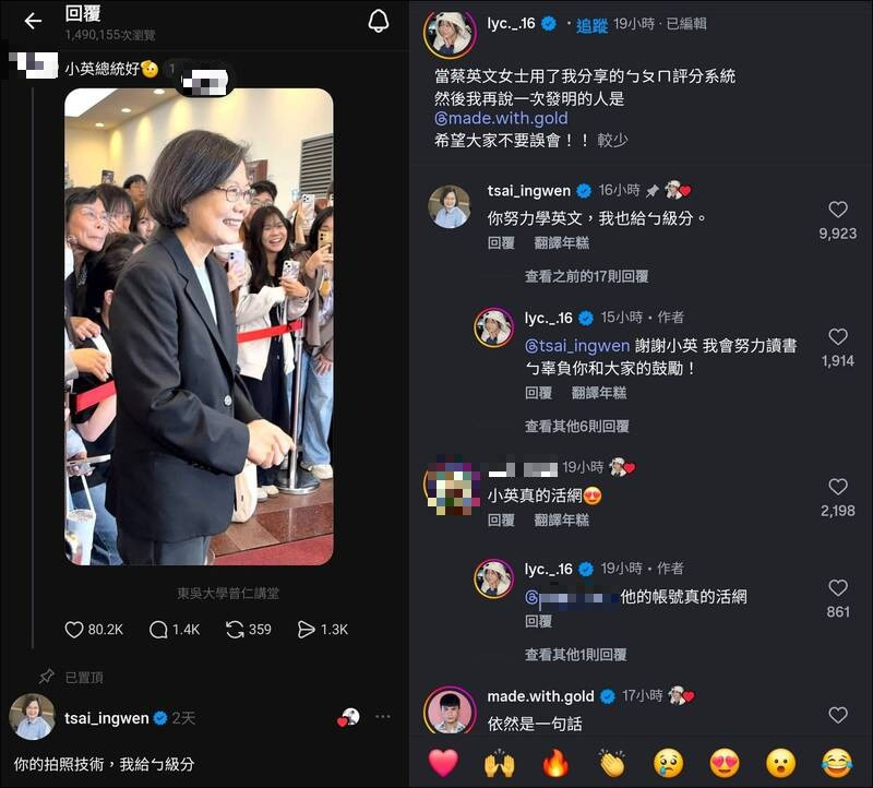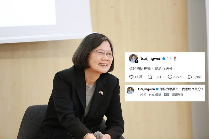 前總統蔡英文在社群上頻繁與網友互動,發文常使用許多網路用語,頻被網友稱讚有夠「活網」,近日她到東吳大學演講後與學生合照,事後還在網路稱讚網友照片「你的拍照技術,我給ㄅ級分」,這番回應再度引發網路熱議。(資料照,蔡英文辦公室提供;圖擷自Threads、IG,本報合成)