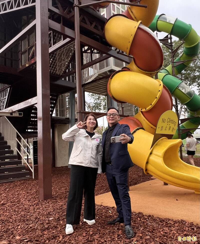 屏東縣以共融遊戲場聞名,童子瑋(右)參訪巴轆公園留下深刻印象,還與屏東縣長周春米(左)開心自拍。(記者羅欣貞攝)