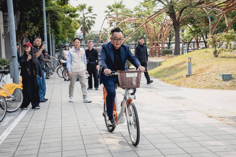 童子瑋在屏東火車站前體驗Youbike。(圖由童子瑋進步基隆辦公室提供)