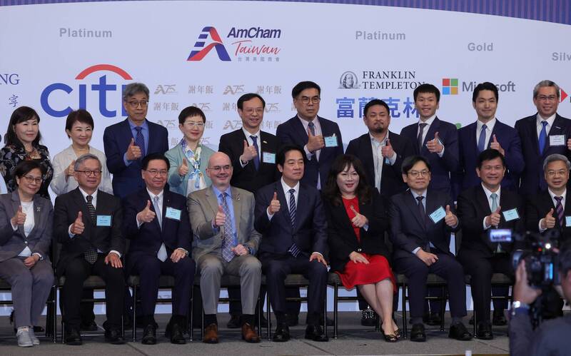 賴清德總統26日率政府首長出席「台灣美國商會2026年謝年飯」,與AIT台北辦事處處長谷立言、台灣美國商會理事長陳幼臻等一同合影。(台北市攝影記者聯誼會提供)