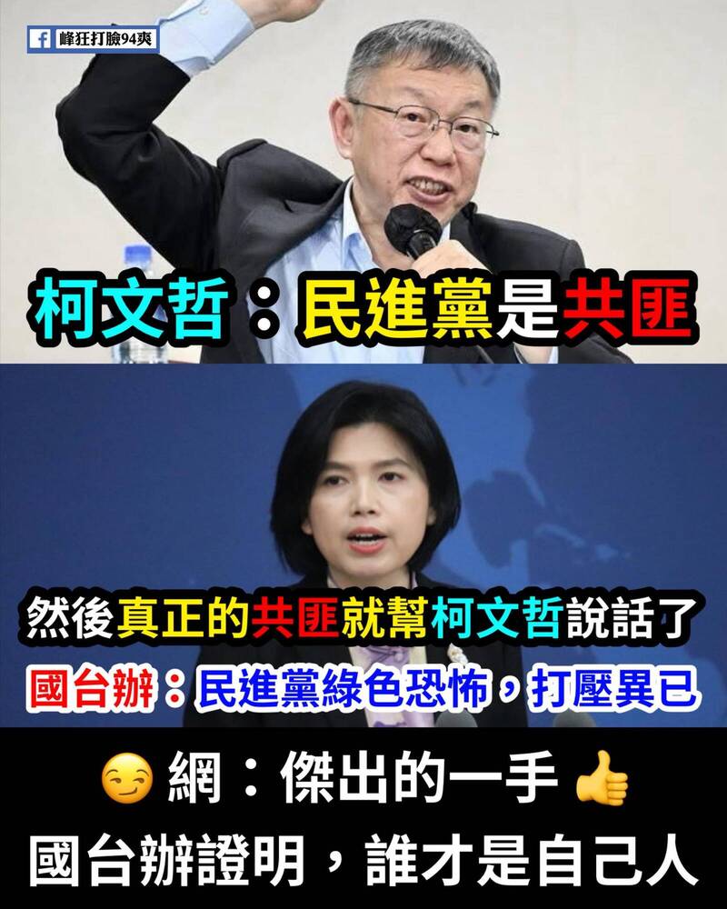 粉專「峰狂打臉94爽」今日發文並附上諷刺梗圖,圖卡內容顯示「柯文哲指稱民進黨是『共匪』,然後真正的『共匪』就幫柯文哲說話了。國台辦指出:民進黨綠色恐怖、打壓異己」。「峰狂打臉94爽」揶揄地說,「國台辦確實是民眾黨與柯文哲最『強而有力』的隊友」。