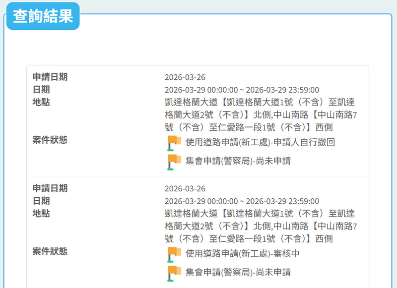 有網友指出,在上「台北市申請使用道路網」查詢後發現,確實有人申請3/29的凱道路權,不過提出申請的日期是在昨日,網友為此質疑「北市府應該不會開特急件、特權給特定政黨吧??」(圖擷自網路)