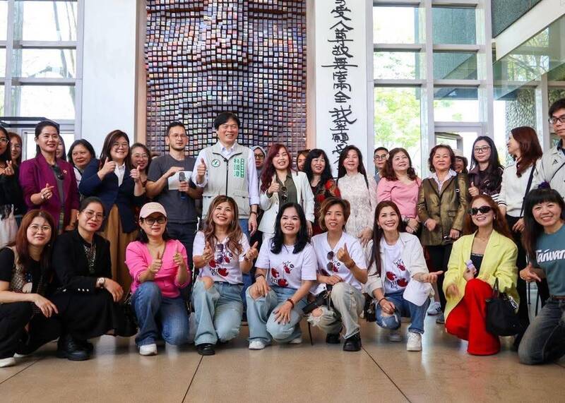 民進黨宜蘭縣長參選人林國漳(中),帶領新住民認識「青天縣長」。(圖取自林國漳粉專)