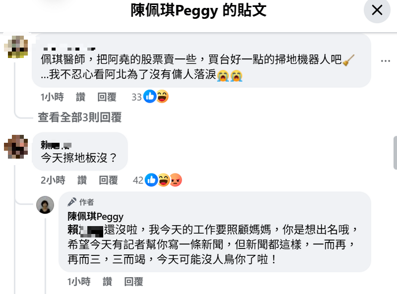 部分網友對其發文留言諷刺,針對有人留言酸「今天擦地板沒?」,陳佩琪也回應稱「還沒啦,我今天的工作要照顧媽媽,你是想出名哦,希望今天有記者幫你寫一條新聞,但新聞都這樣,一而再,再而三,三而竭,今天可能沒人鳥你了啦!」