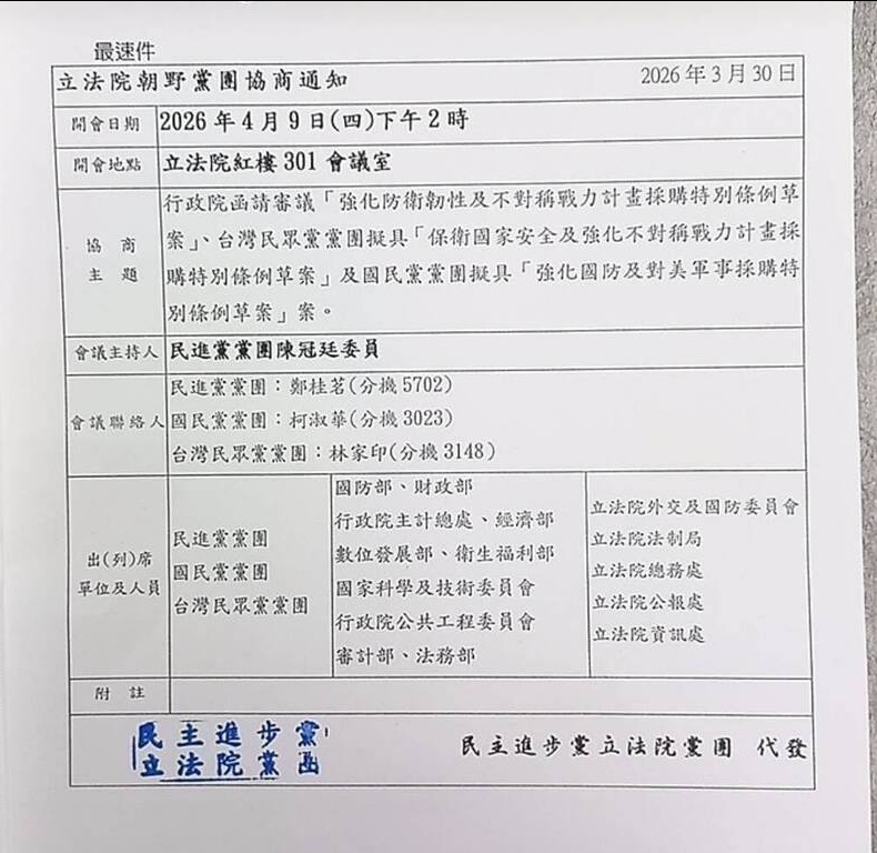 周軒今晚在臉書PO出國民黨立院黨團的發函,原本朝野預計9日下午針對審議軍購條例召開黨團協商,沒想到藍營總召傅崐萁、書記長林沛祥、首席副書記長許宇甄蓋上官印的發函上要求,協商延期至4月15日或4月16日,上頭並未說明原因,僅稱這是「為促協商順利」。