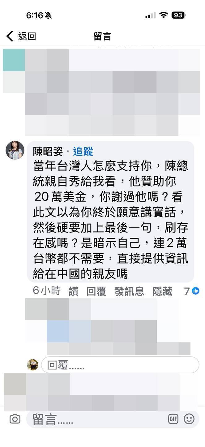 此番言論引來民眾黨立委陳昭姿在貼文下方留言開罵,陳昭姿嗆王丹是在「刷存在感」,更當場翻開舊帳,指稱當年台灣人與前總統陳水扁是如何鼎力支持王丹,陳昭姿聲稱,「陳總統親自秀給我看,他贊助你20萬美金,你謝過他嗎?」,更諷刺王丹「是暗示自己連2萬台幣都不需要,直接提供資訊給在中國的親友嗎?」