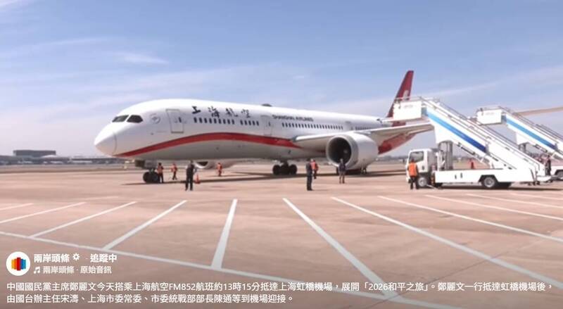 國民黨主席鄭麗文搭乘上海航空訪中,中媒宣傳中共中央台辦主任宋濤、上海市委統戰部長陳通接機。(擷取自《兩岸頭條》)