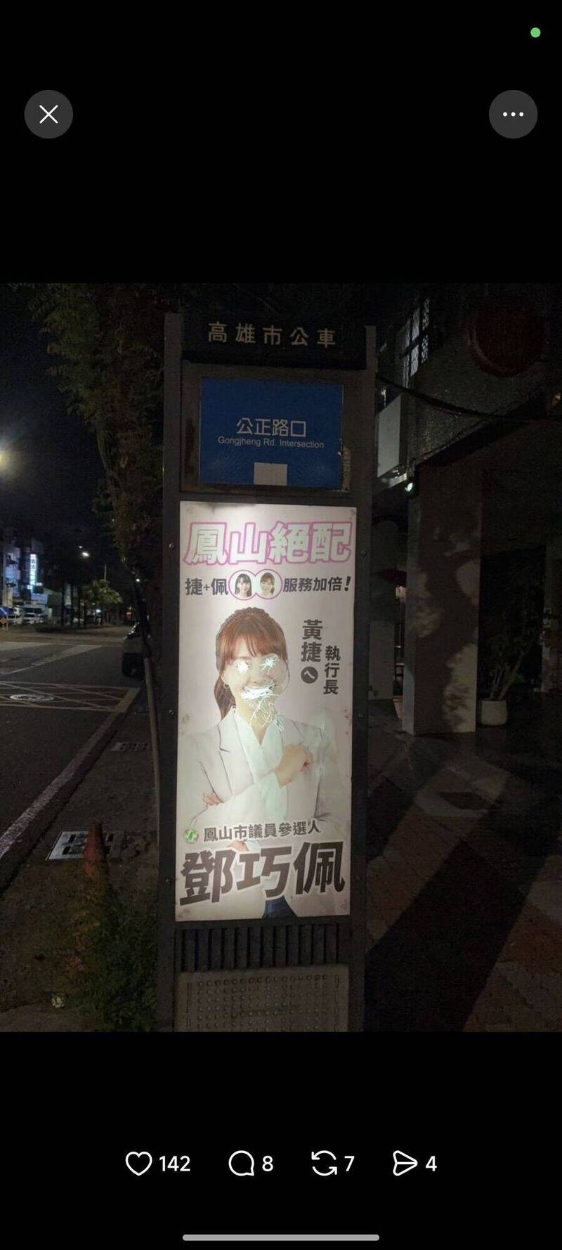 前鎮分局員警7日2時許在保泰路公車站牌,發現市議員參選人選舉看板疑遭刮損,立即聯繫參選人服務處,鄧巧佩於7日下午4時30分許,至瑞隆派出所完成報案。