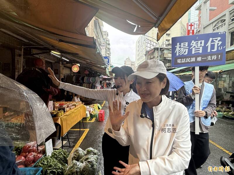 國民黨立委柯志恩今(8)日陪同該選區擬參選人楊智伃掃吳興市場,一一向攤商握手、懇託,力薦楊智伃。(記者孫唯容攝)