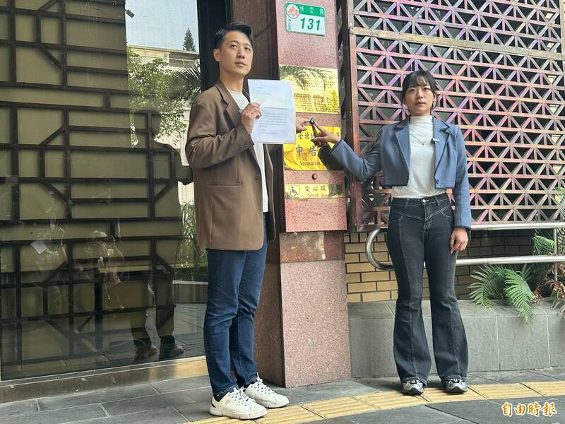 國民黨台北、新北市議員擬參選人楊智伃、鄧凱勛認定管碧玲涉犯洩漏交付國防秘密等罪,今上午赴台北地檢署進行告發。(記者吳昇儒攝)