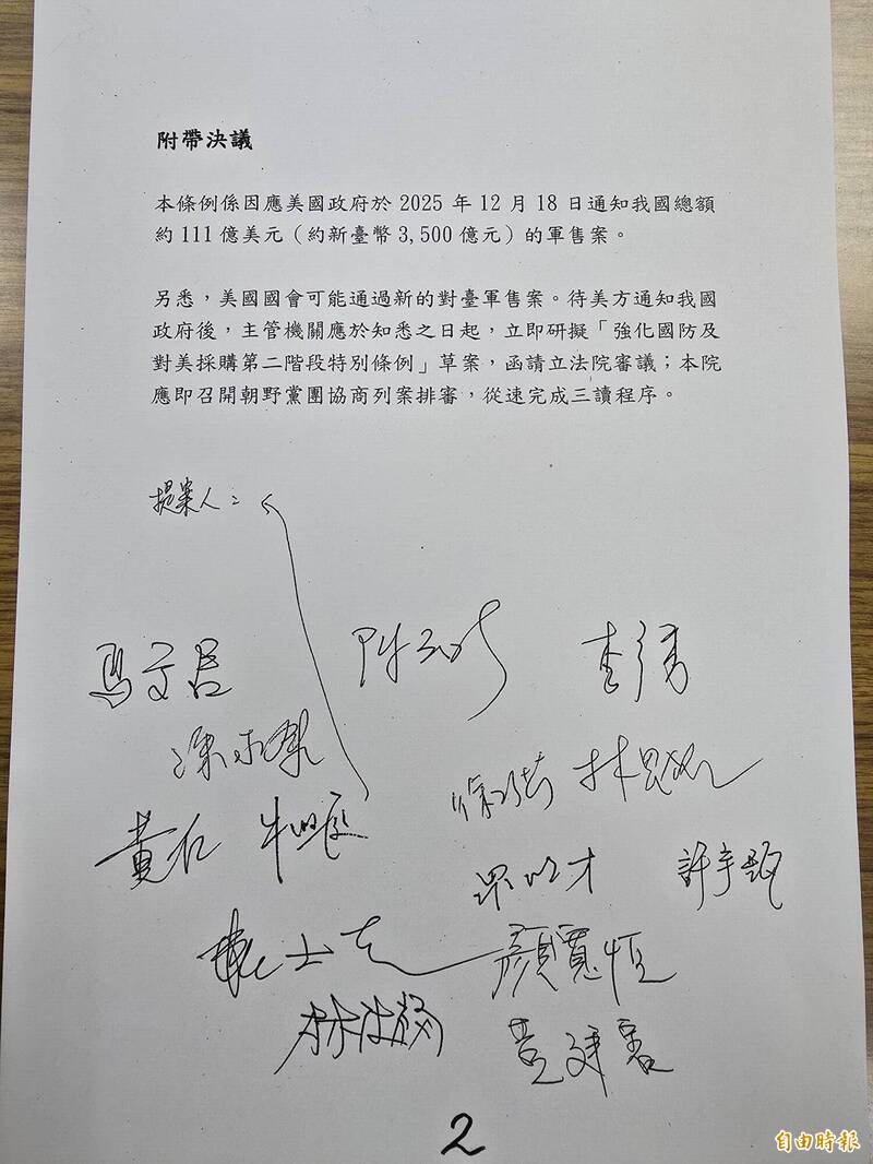 該份決議文下方由多位國民黨籍立委簽署,包括馬文君、陳玉珍、李彥秀、廖先翔、徐巧芯、林思銘、黃仁、牛煦庭、羅廷瑋、許宇甄、張智倫、顏寬恒、林沛祥、葛如鈞等人。