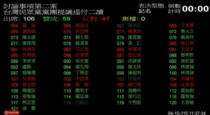 民眾黨團今日提案延長立法院第11屆第5會期至今年7月31日,表決結果,贊成59人、反對47人。(翻攝自臉書)