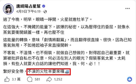 「國師」唐綺陽在9日的貼文提到,明早,眼睛一睜開,火星就進牡羊了。在這強大、不掩藏的能量下,該爆的秘密,以為壓得住的委屈,就像水蒸氣要衝開鍋蓋一樣,再也壓不住。