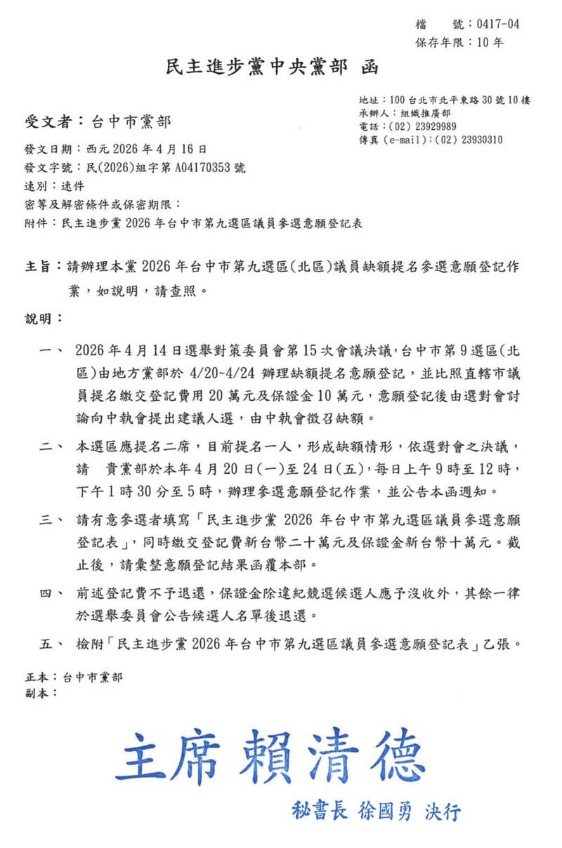 民進黨台中第九選區(北區)議員提名出現一席空缺,宣佈將舉行缺額提名登記。(民進黨台中市黨部提供)