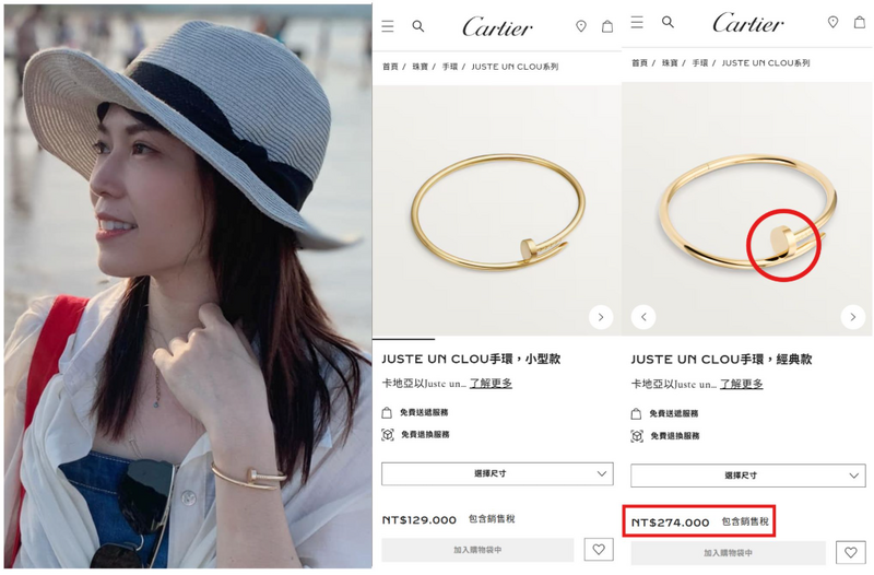 四叉貓還不忘酸,當時誤發的照片上,陳智菡手上戴了要價12萬9000元的卡地亞「Juste un Clou手環」。