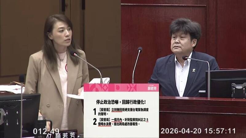 台北市議員顏若芳(左)質詢翡管局長林裕益。(擷取自台北市議會官網)