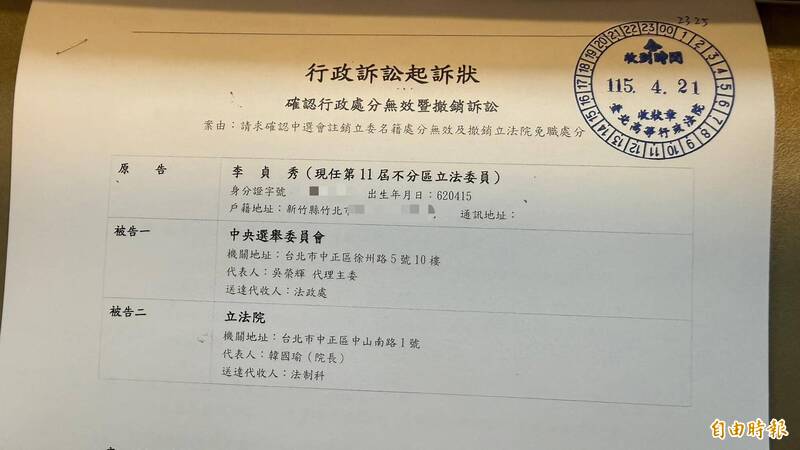 李貞秀出示行政訴訟起訴狀,表明已向行政法院對中選會與立法院提出行政訴訟,要求確認中選會註銷立委名籍處分無效及撤銷立法院免職處分。最後還稱「我們法庭見」。
