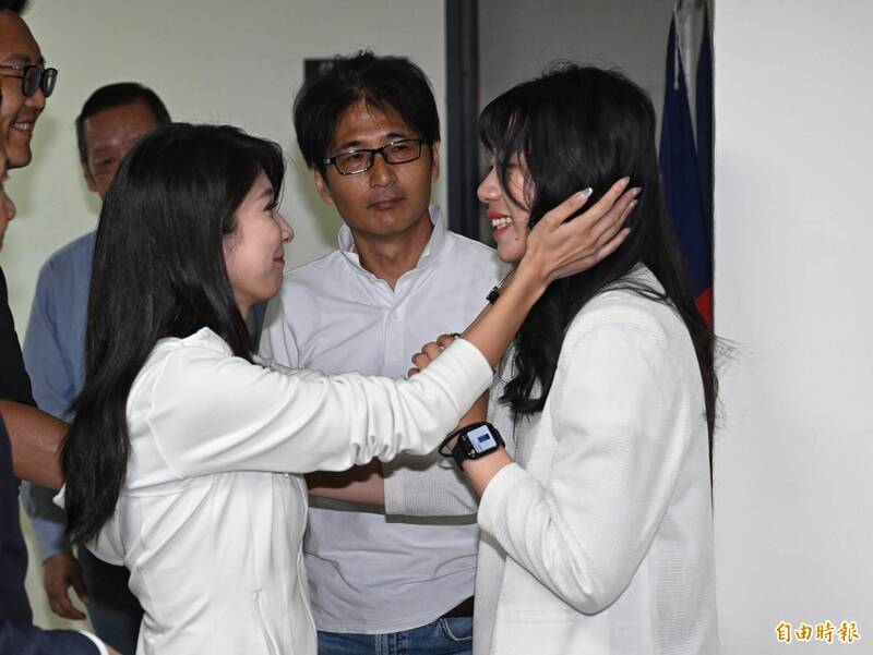 國民黨松山信義市議員初選民調結果22日出爐,勝出的李明璇(左)給落敗的楊智伃(右)「惜惜」和擁抱。(記者張嘉明攝)
