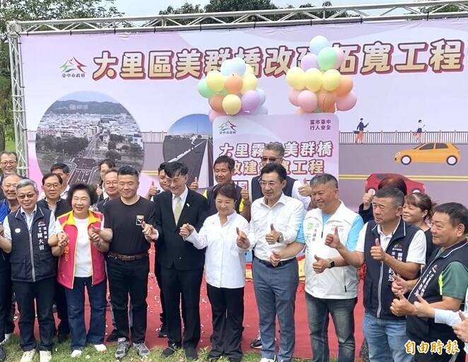 大里區美群橋拓寬改建開工典禮上午舉辦,台中市長盧秀燕帶著國民黨台中市長參選人江啟臣主持儀式,而在開工前,民進黨台中市長參選人何欣純,經在地3名議員陪同,搶先宣布爭取近4億預算改建,預計後年1月完工通車、橋面從8公尺變16.5公尺。