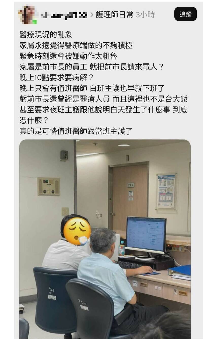 有醫護人員在社群爆料,指病患家屬是「前市長」的員工,「就把前市長請來電人?」醫護也質疑,晚上10點到醫院要求解釋病情,但晚上只有值班醫師,前市長曾是醫療人員,這裡也不是台大,到底憑什麼?發文中還貼出一張照片,背影看上去很像柯文哲。
