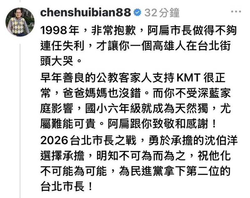 對於立委沈伯洋代表民進黨參選台北市長的呼聲高,前總統陳水扁今(27)日在社群平台Threads回應網友貼文時,向該網友道歉說,1998年是他做得不夠,連任台北市長失利,才讓這位網友在台北街頭大哭,沈伯洋選擇承擔,明知不可為而為之,祝沈化不可能為可能,為民進黨拿下史上第二位台北市長。