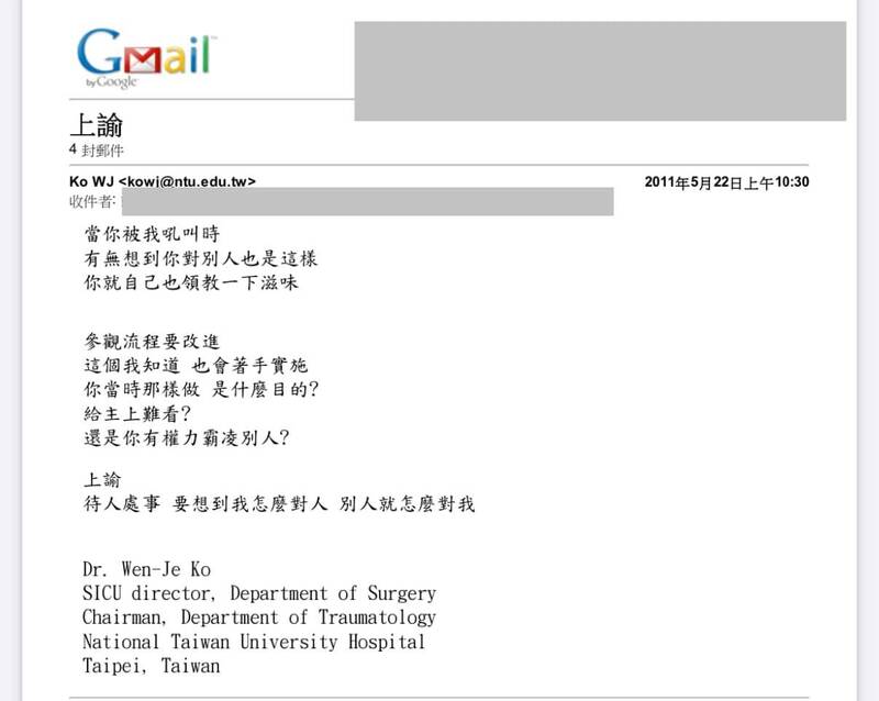其實王介立醫師早在2024年就於臉書曝光約莫15年前柯文哲寄給他的電子郵件,郵件標題甚至叫「上諭」,內容為「當你被我吼叫時,有無想到你對別人也是這樣,你就自己也領教一下滋味。參觀流程要改進,這個我知道,也會著手實施,你當時那樣做,是什麼目的?給主上難看?還是你有權力霸凌別人?上諭,待人處事,要想到我怎麼對人,別人就怎麼對我。」