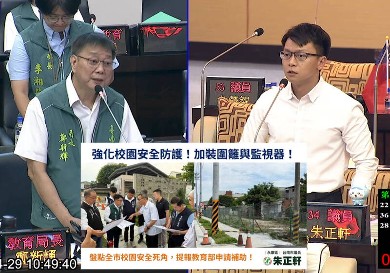 南市議員朱正暫質詢教育局,呼籲全面盤點校園死角 ,強化監視設備保障學生通學安全。(擷自南市議會直播影音畫面)