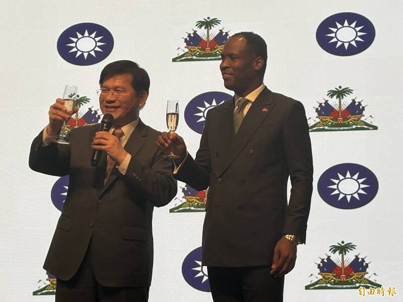 海地共和國大使館今日舉辦「海地台灣建交70週年」慶祝晚宴,由海地駐台大使潘恩(右)主持,外交部長林佳龍(左)受邀出席並致詞。(記者黃靖媗攝)
