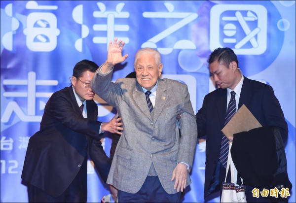前總統李登輝(中)2日應邀出席台灣教授協會「海洋之國 走向國際」年終募款餐會,致詞並揮手向在場人士致意。(記者廖振輝攝)