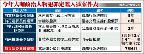 今年大咖政治人物犯罪定讞入獄案件表