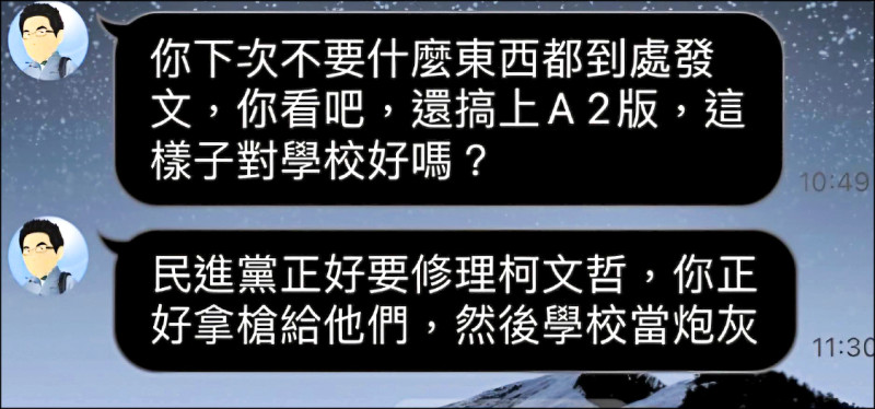 向本報投訴的學生表示,十日上午接到副校長LINE訊息,內容寫著「你下次不要什麼東西都到處發文,還搞上A2版,這樣子對學校好嗎?」又說「民進黨要修理柯文哲,你正好拿槍給他們,把學校當砲灰」。這番言論令他無法接受,認為學校面對爭議與疑慮應正視,而不是搞白色恐怖、秋後算帳。