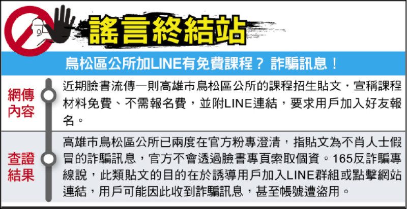近期臉書流傳一則高雄市鳥松區公所的課程招生貼文,宣稱課程材料免費、不需報名費,並附LINE連結,要求用戶加入好友報名。
