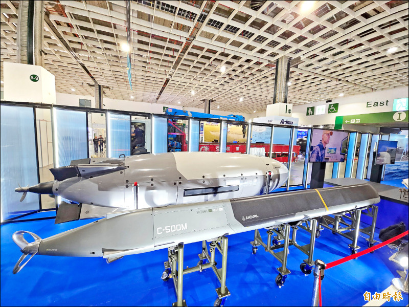 中科院與美商安杜里爾合作展出的自主水下與空射載具,清楚印有「TAIWAN USA」及雙方國旗圖樣。(記者方瑋立攝)