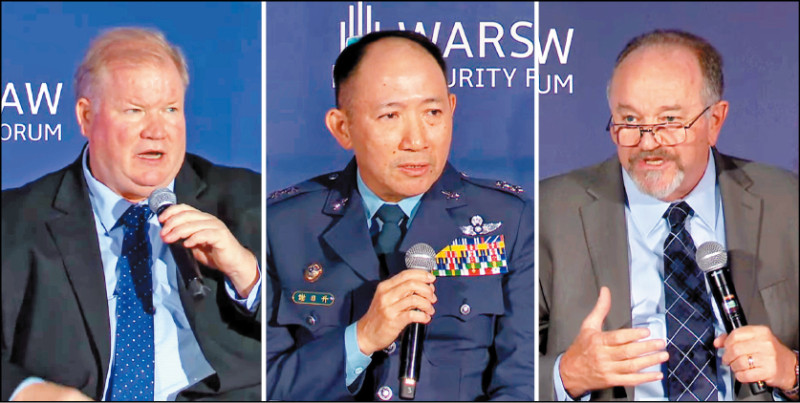 國防部參謀本部情報參謀次長室次長謝日升中將(中)上月卅日應邀出席華沙安全論壇,與前北約歐洲盟軍最高統帥、美國空軍退役上將布里德羅佛(右)、美國海軍退役少將蒙哥馬利(左)及歐洲安全專家對談。(圖擷取自華沙安全論壇官方頻道)