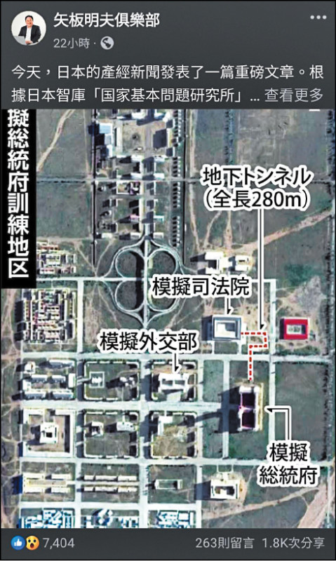 共軍為了強化對台「斬首行動」訓練,在內蒙古的朱日和戰術訓練基地,擴建模擬台北核心建物。日媒報導,日本智庫「國家基本問題研究所」(國基研)公布最新的衛星圖像分析顯示,該基地明顯加速擴建,除了模擬總統府,新建的「模擬司法院」也已完工,並建有一條全長二八〇公尺連結總統府的地道。